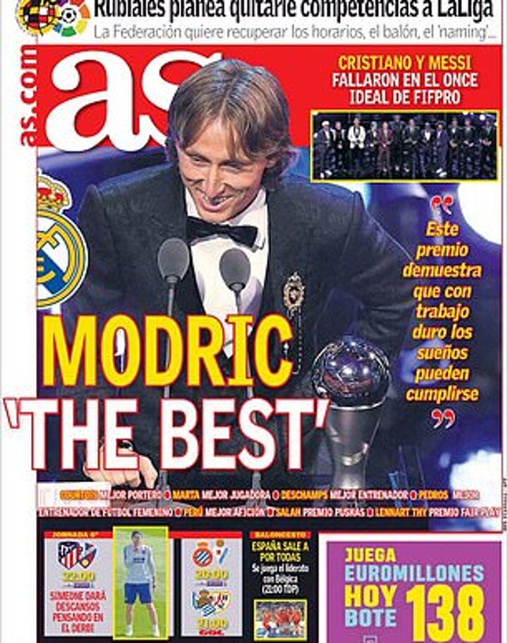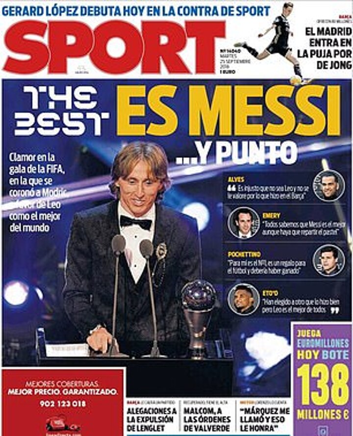 'Modric wins The Best but the best isn't there' said Mundo Deportivo. 'The Best is Messi end of story,' sniped Sport who also covered their front page with quotes from Dani Alves, Unai Emery and Samuel Eto'o all saying that in their opinion: 'Messi is the best'.