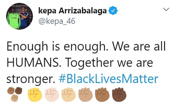Goalkeeper Kepa explained their motivation, tweeting: 'Enough is enough. We are all HUMANS. Together we are stronger. #BlackLivesMatter'.