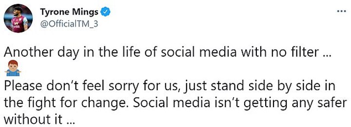 Mings tweeted: 'Another day in the life of social media with no filter... Please don't feel sorry for us, just stand side by side in the fight for change. Social media isn't getting any safer without it.'