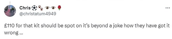 One supporter took to social media to criticise the error, saying: '£110 for that kit, should be spot on. It's beyond a joke. How have they got it wrong?'