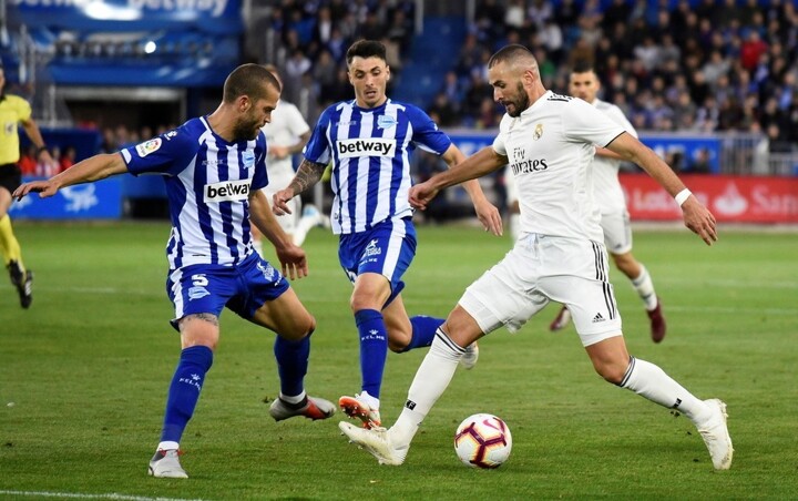 Off the line! A wonderful clearance from Alaves after Odriozola's cross sees Benzema head a powerful effort towards goal. Navarro gets himself in the way and lashes it clear with brilliant reflexes.