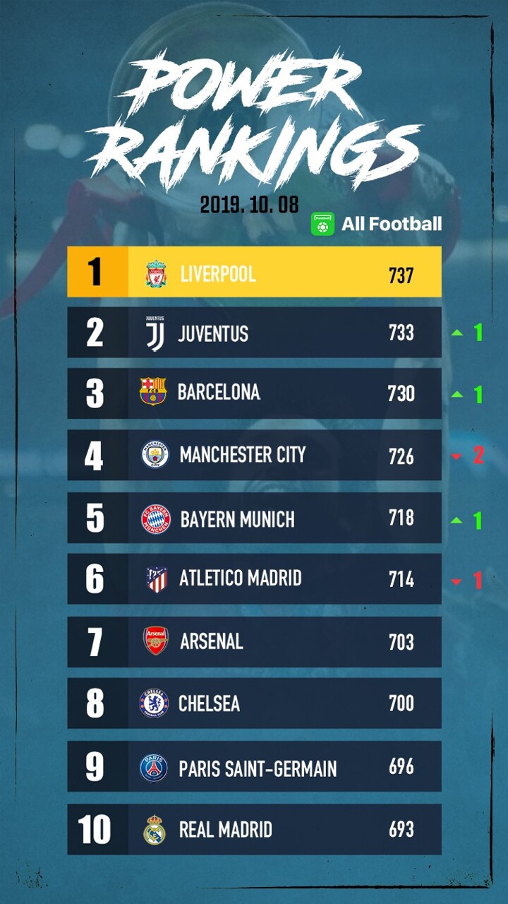 Hello again! We organize clubs of Europe's top leagues into an order that reflects the up-to-the-minute hierarchy every Tuesday.