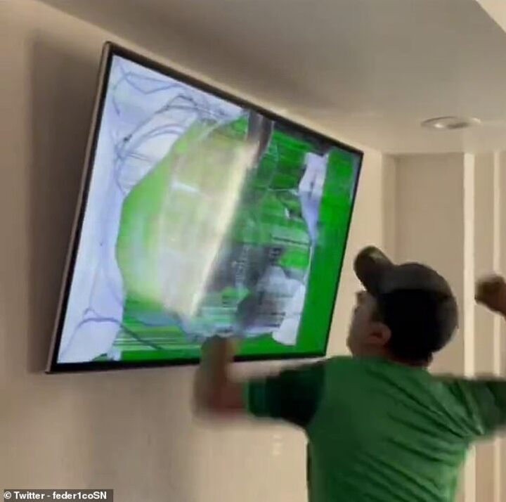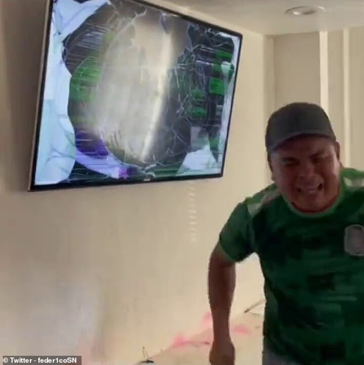 And moments after their exit, one Mexico fan failed to control his emotions with footage showing him smashing his TV screen with a flurry of punches before bizarrely taking a knife to it in a blind rage.