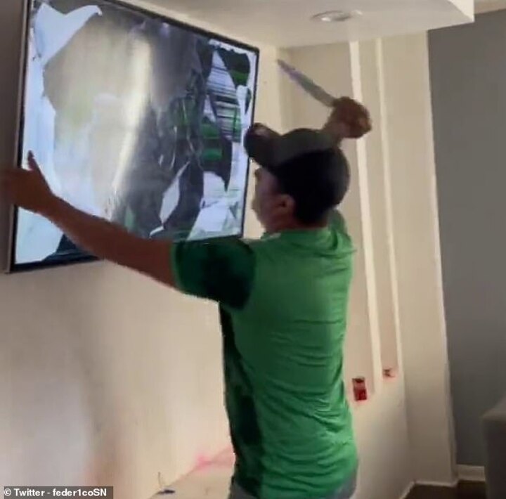 The video begins with the Mexico fan punching the TV mounted on the wall before running off screen to collect a large knife - before repeatedly stabbing it. The emotional fan is then seen walking away from the TV.