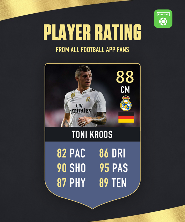 Hello everyone, welcome to - Daily Player Rating! You could be the judge and rate one player every day at 10:30 CET. The results will be declared in the form of Fut Card tomorrow. We released the rating of Toni Kroos yesterday. He got 88 total points with highest 95 in passing. The detailed results are as follows: