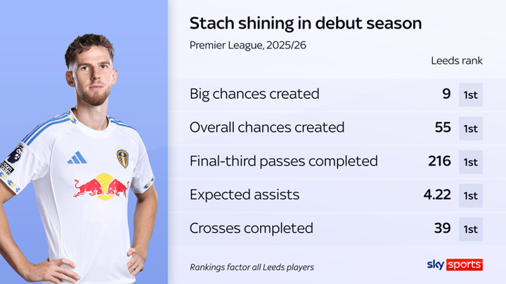 He bears a lot of all the best hallmarks of this battling Leeds team, clinical at set-pieces but also a hard runner, as keen to tackle and dominate duels as he is to find ways to unlock teams in possession. Stach controls the tempo, Leeds' chief courier of passes into the final third and most accurate crosser of the ball.