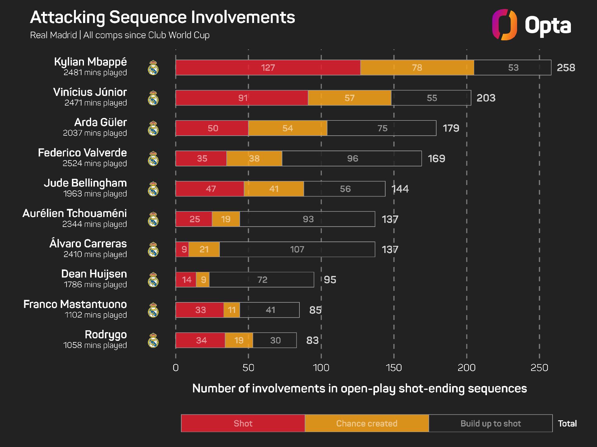 But when it comes to attacking sequence involvements, Mbappe (258) and Vinicius (203) have been Madrid's two most influential players since the end of the Club World Cup.