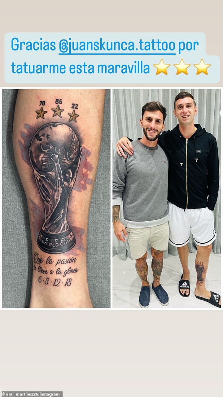 Emiliano Martinez has shared a photo of his new tattoo of the FIFA World Cup Trophy on his leg to commemorate Argentina's victory in Qatar.