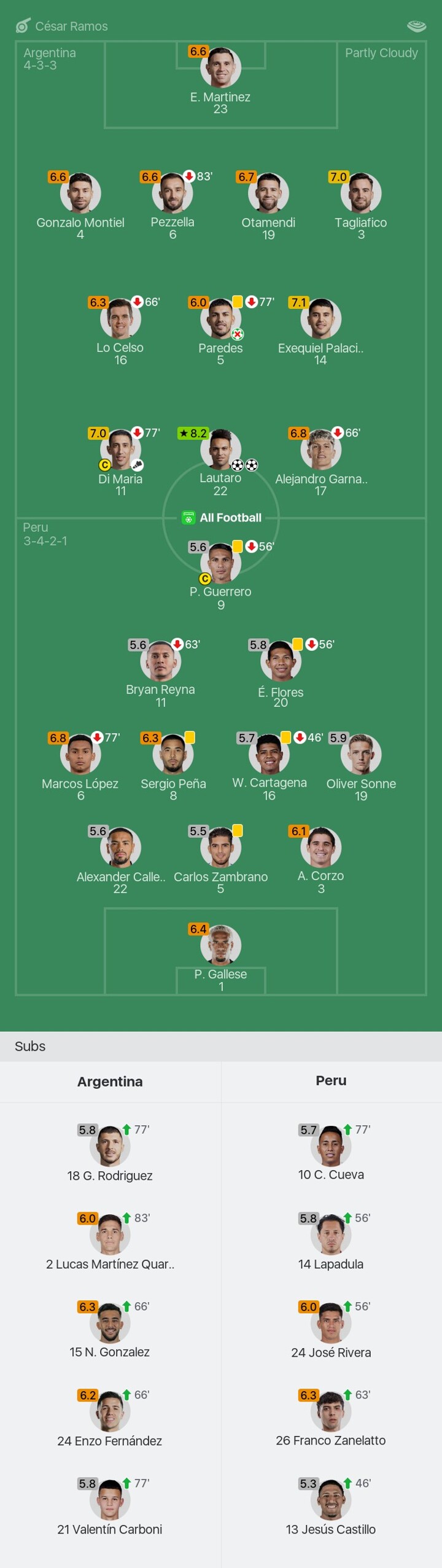 We bring you the player ratings for Argentina vs Peru as Lautaro becomes Man of the Match with a rating of 8.2.
