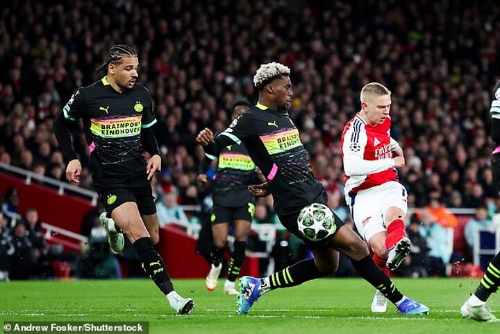 Arsenal plundered seven goals of eight shots on target in Eindhoven and continued in the same vein when Oleksandr Zinchenko found the net with the first effort of the second leg, a goal fizzed past goalkeeper Walter Benitez from 25 yards.