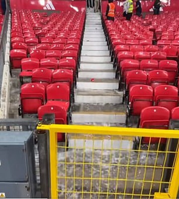 In one clip, supporters could be seen giving a wide berth to the deluge that was coming through the ceiling in one of the concourses. In another shocking video, streams of rainwater flowed down the stands and out onto the pitch below.
