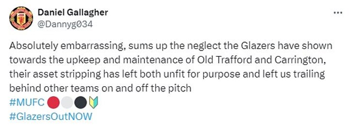 'Absolutely embarrassing, sums up the neglect the Glazers have shown towards the upkeep and maintenance of Old Trafford and Carrington,' one fan wrote on X, formerly Twitter.
