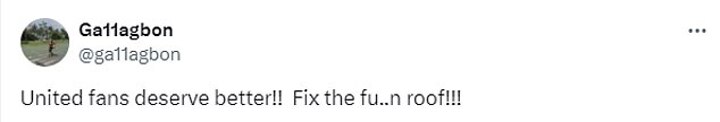 Another wrote: 'United fans deserve better!! Fix the fu..n roof!!!' A third said: 'Clubs rotten in every single aspect.'