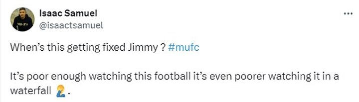 'When’s this getting fixed [Ratcliffe]?' Wrote one fan. 'It’s poor enough watching this football it’s even poorer watching it in a waterfall.'