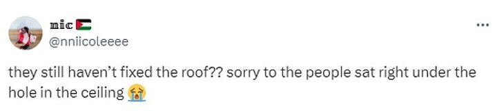 'They still haven’t fixed the roof?? sorry to the people sat right under the hole in the ceiling,' said another.