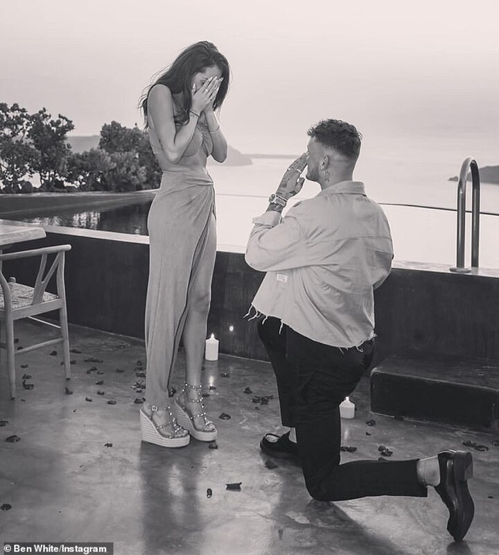 In a series of black and white photos shared with Instagram followers, Ben got down on one knee in front of a shocked Milly by an infinity pool overlooking the sea.