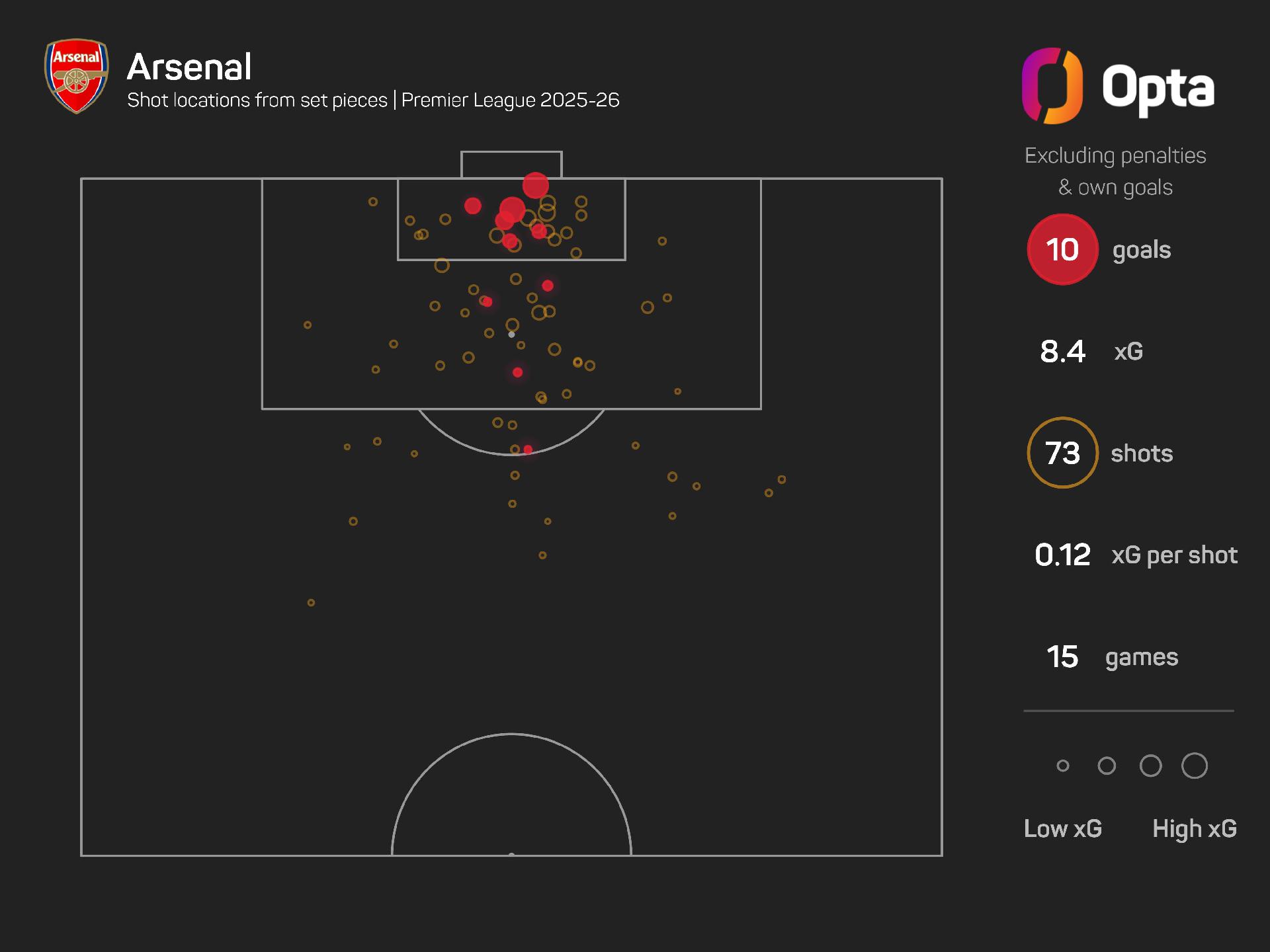 The Gunners have created a total of 8.4 expected goals (xG) from set-plays, compared to 16.2 xG from open play.