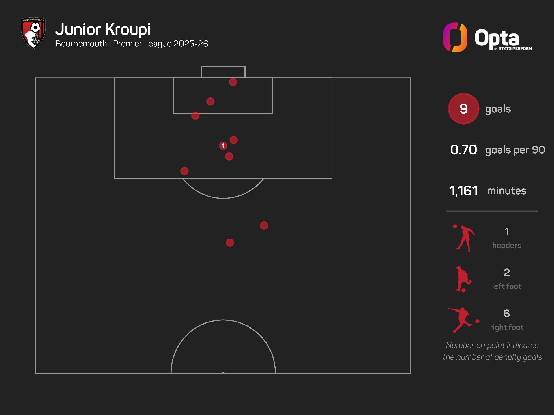 Kroupi became the first teenager to score a Premier League penalty against Man United and the fourth teen to net home and away against the Red Devils in a single campaign, and the young talent will be hoping to get into double figures for the campaign here.