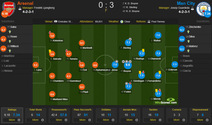 WHAT A STRIKE FROM DE BRUYNE! 3-0 CITY! Arsenal are temporarily reduced to ten men while they prepare to substitute Kolasinac and City take full advantage! Foden gracefully drove through the heart of the Arsenal midfield, before slipping a pass through to De Bruyne, who elected to shoot against a backtracking Arsenal defence and his low effort from 25 yards swerves viciously into the bottom corner beyond Leno!