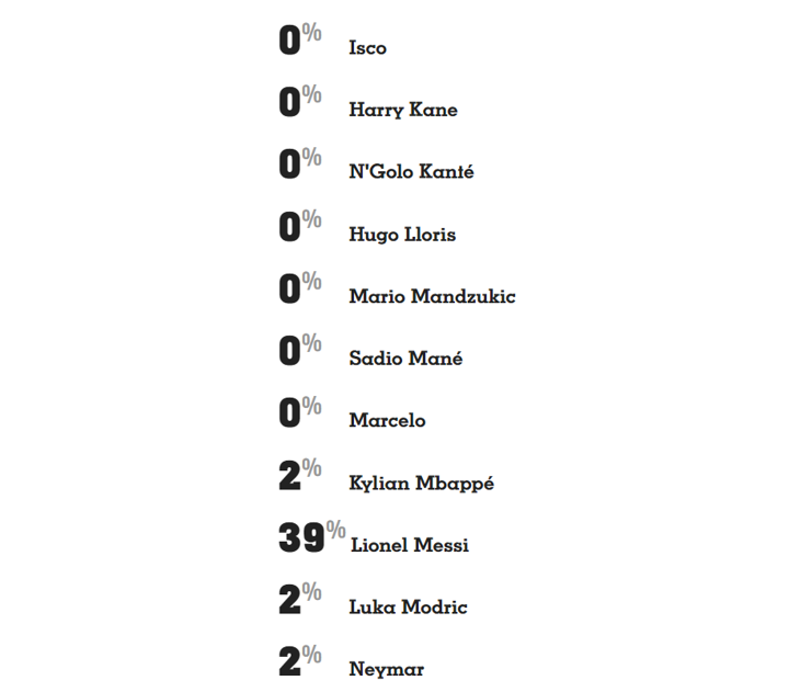 No other player has more than 5%, including FIFA The Best Men's Player of the Year winner Luka Modric.
