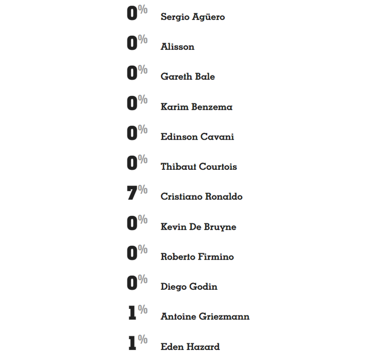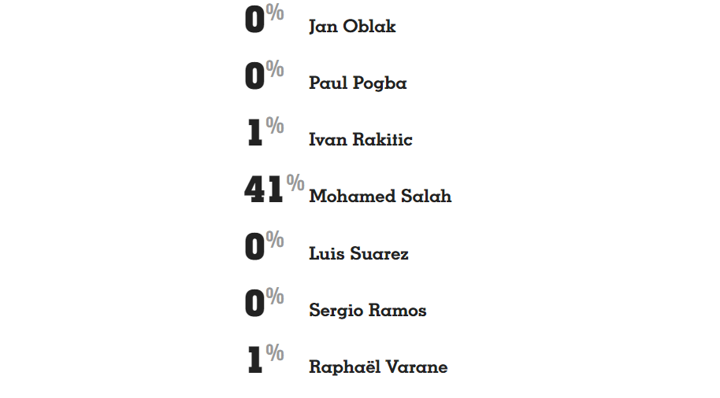 Neymar receives 2% while Ivan Rakitic and Raphael Varane both get 1%.