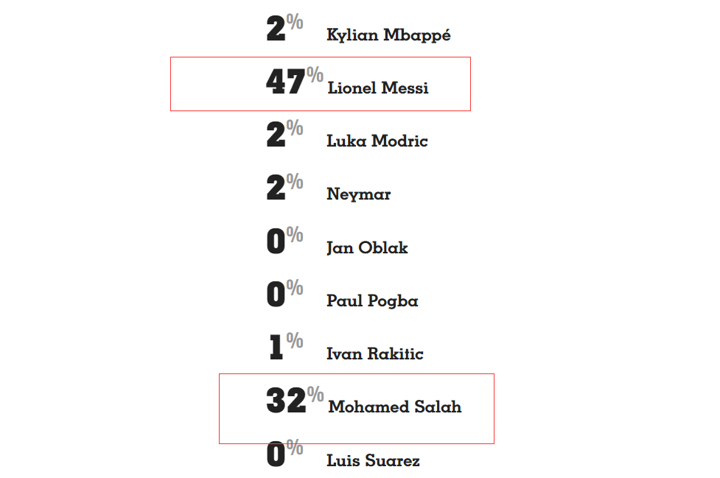 Mohamed Salah is leading the poll with 41% of the vote until now (15:49 CET), Lionel Messi is second with 39%, Cristiano Ronaldo sits third with 7%.