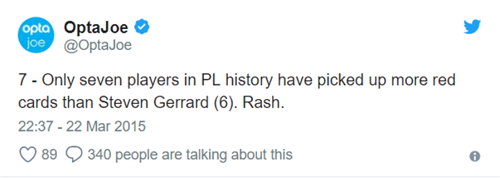 Clashes between Liverpool and Man United are rarely uneventful and Gerrard made sure his final such match followed a similar pattern. Just 38 seconds after coming on as a substitute, the Reds captain launched himself at Ander Herrera, sinking his studs into the Spaniard's leg in a gruesome tackle. A red card was the least he could have expected, and ultimately his final match against Liverpool's arch enemy ended in a 2-1 defeat.