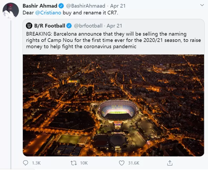 Bashir Ahmad, Personal Assistant on New Media to Muhammadu Buhari, president of Nigeria, also takes part in the discussion after Barcelona announced that they will cede the naming rights of Camp Nou to its foundation to fight against COVID-19.