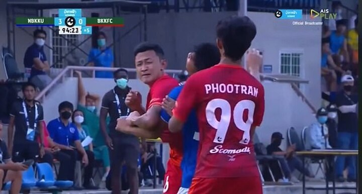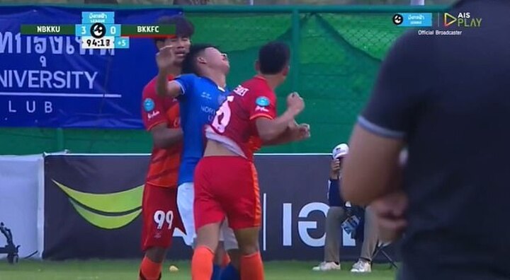 Aitsaret Noichaiboon was caught on camera attacking North Bangkok University's Supasan Ruangsuphanimit in the fifth minute of stoppage time in a third division match.