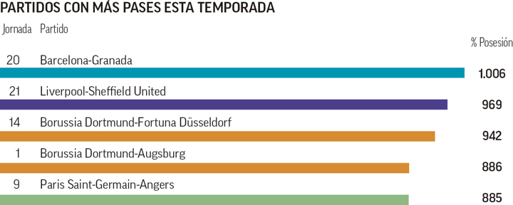 Liverpool's aforementioned passing record stood at 969 passes against Sheffield United, although they were closely followed by Lucien Favre's Borussia Dortmund, who registered 942 and 886 passes against Fortuna Dusseldorf and Augsburg respectively.