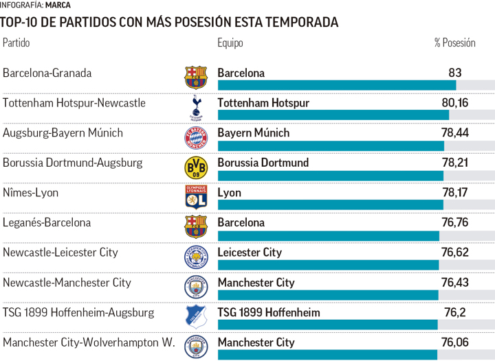 Bayern Munich have the highest average possession number for the 2019/20 season, with the Bavarian giants holding an average of 67 percent possession this term.