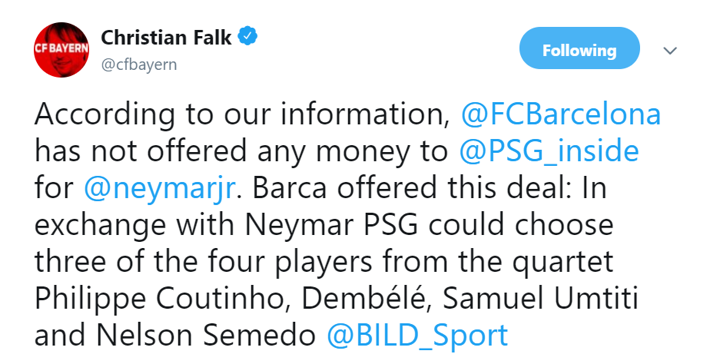 'In exchange with Neymar PSG could choose three of the four players from the quartet Philippe Coutinho, Dembélé, Samuel Umtiti and Nelson Semedo', says Christian Falk on his twitter.