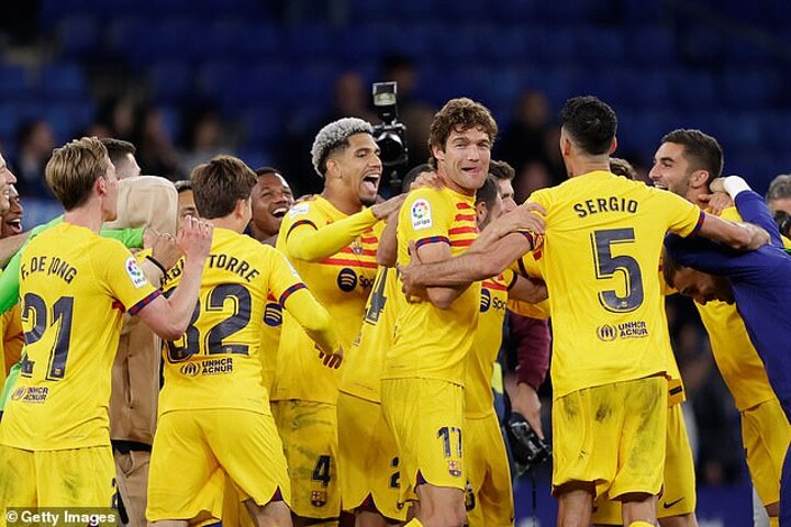 The players were celebrating in the centre-circle, jumping round in a ring after they were confirmed LaLiga champions with the 4-2 victory against their rivals.