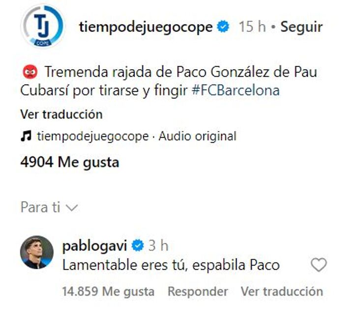 Which was not taken well by Cubarsi’s teammate Gavi, who was in the stands to watch the 3-3 draw as he recovers from his injury. Gavi replied to the clip of Gonzalez’s criticism on Instagram saying “Pathetic is what you are, smarten up Paco.”