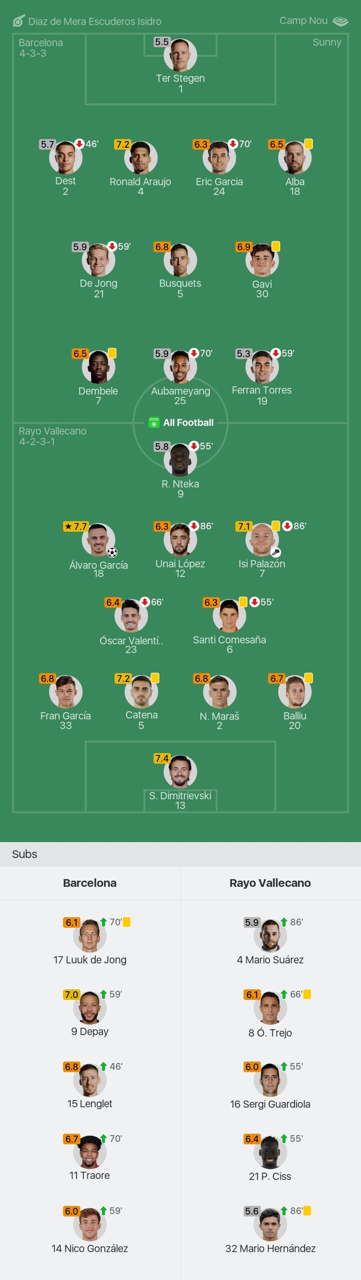 We bring you the player ratings for Barcelona vs Rayo Vallecano as Álvaro García becomes Man of the Match with a rating of 7.7.