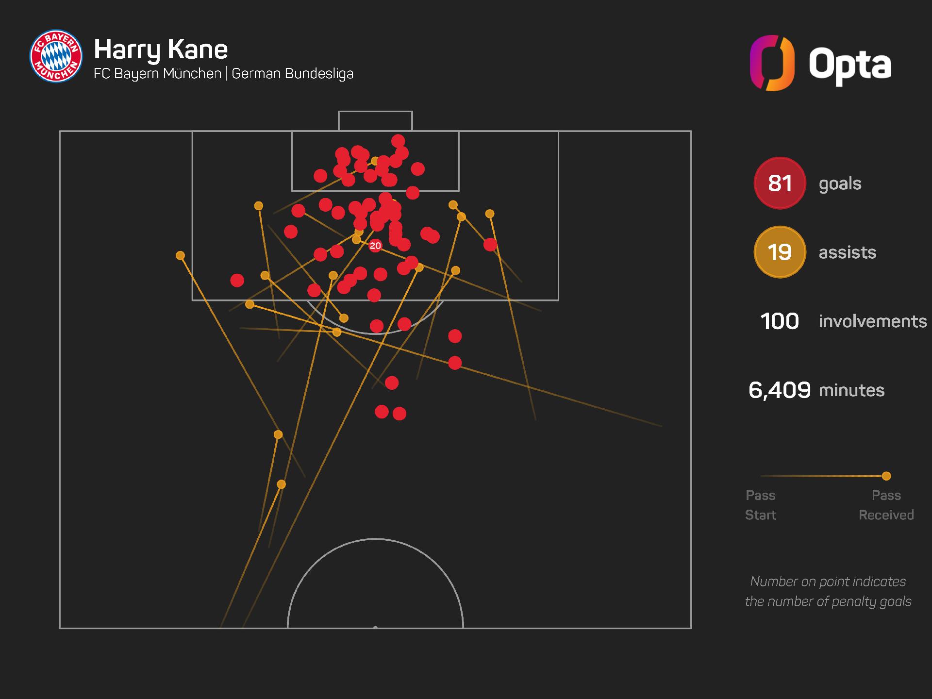 Meanwhile, Kane's 92nd-minute goal was his 51st for Bayern in all competitions, but it also saw him register his 100th goal involvement in Germany's top tier.