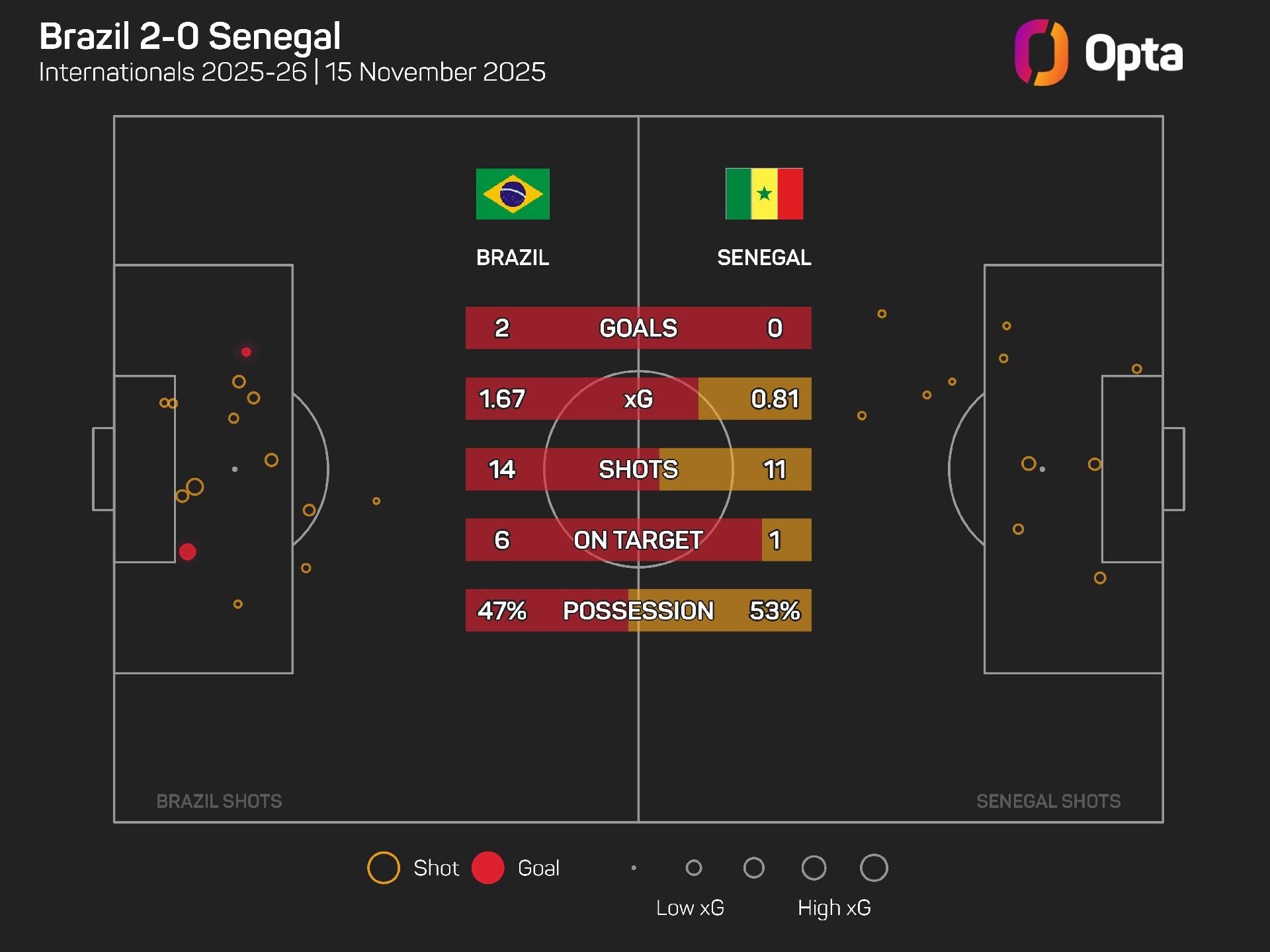 The Selecao fired off 14 shots with an expected goals (xG) value of 1.67, compared to Senegal's 11 shots and 0.81 xG. Nine of Brazil's efforts, and 1.4 of their total xG tally, came prior to the half-time whistle.