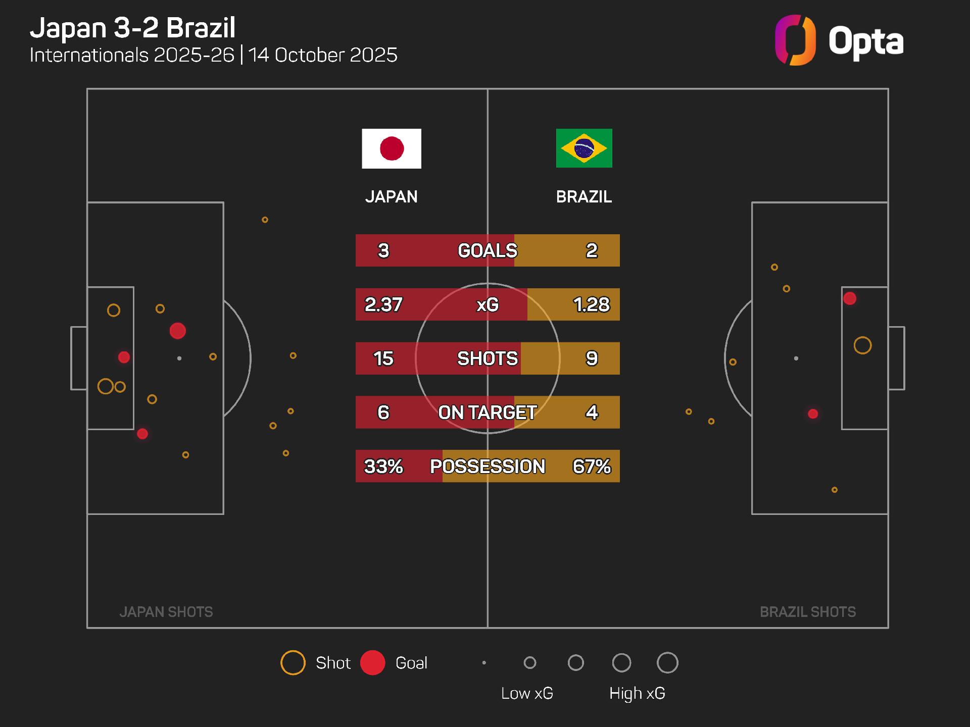 Brazil struggled for creativity at Ajinomoto Stadium, as they produced just 1.3 expected goals (xG) from nine attempts (four on target).