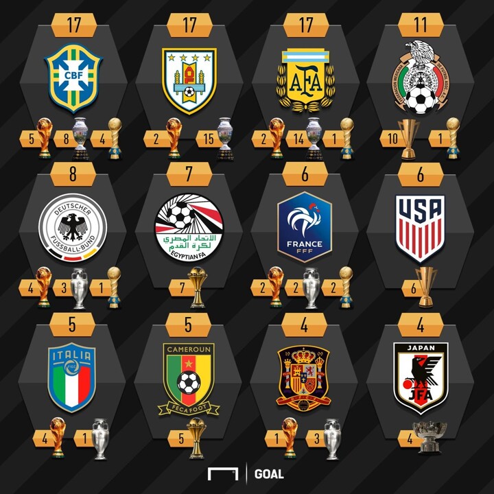 Most international titles per country ↓ Can Brazil or Argentina make it 18 at the Copa America? Copyright Declaration