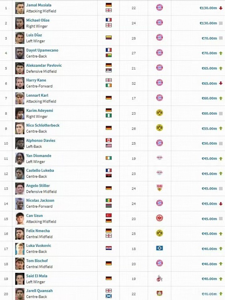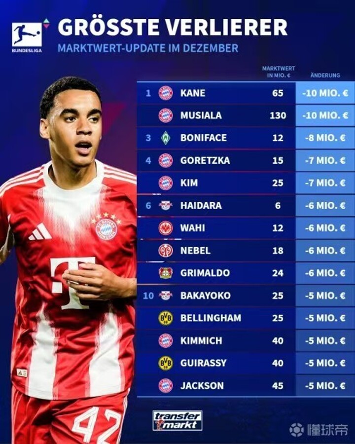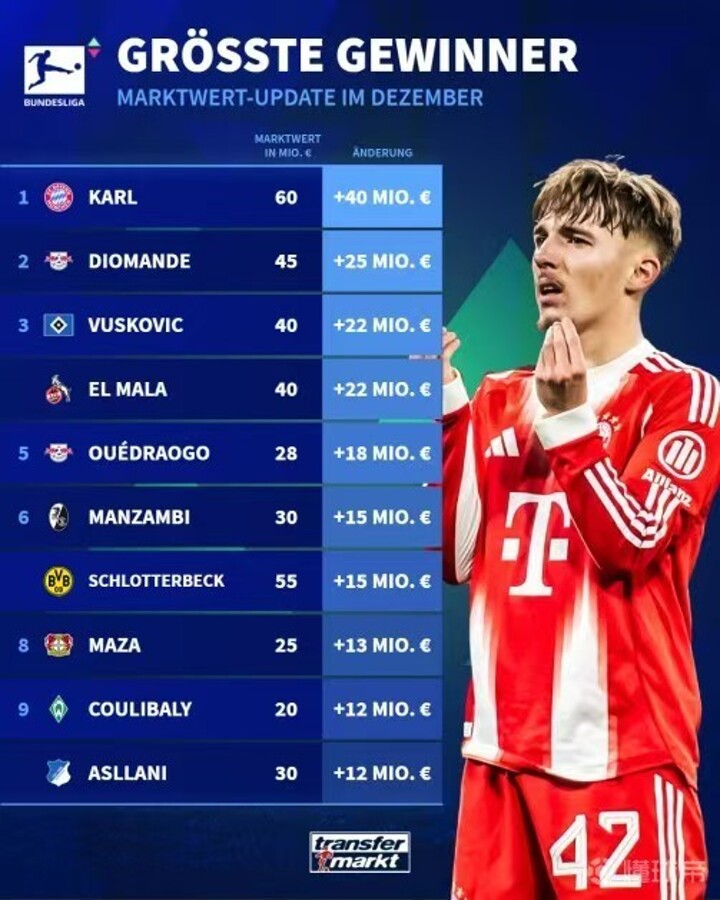 On December 19, the Bundesliga released its latest market value updates: Musiala has dropped to €130 million, tying with Olise for the top spot; Harry Kane’s value has fallen to €65 million, while Karl’s value has skyrocketed to €60 million.