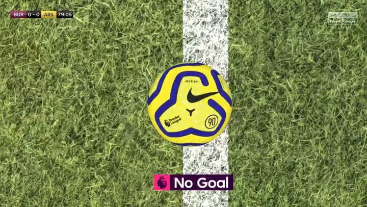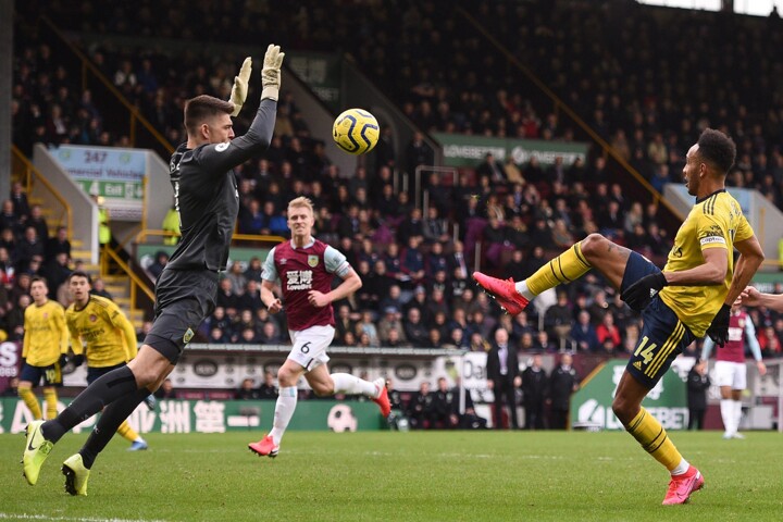 Xhaka spots Aubameyang's run and chips a pass over the Burnley defence. Aubameyang only has the keeper to beat but Pope's straight out of his goal and raises his hands to block Aubameyang's close-range dink.