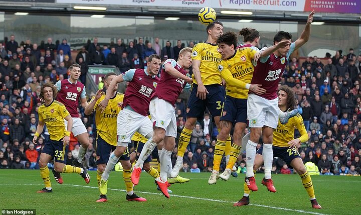 The free-kick comes in and Tarkowski and Mee are queueing up to head it in at the far post! In the end, Tarkowski makes contact but can only fire it wide of the post. Arsenal have been warned now.