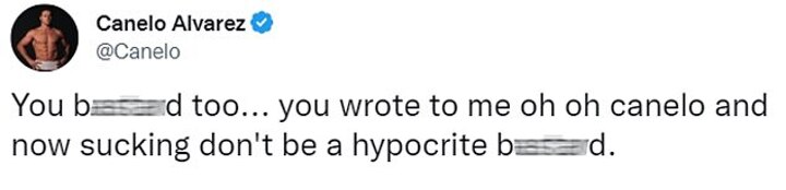 But the four-weight champion fighter responded was not to be deterred, firing back with: 'You too, b******? You used to write me, "oh, oh, Canelo", and now you're crying. Don't be a hypocrite, b******.'