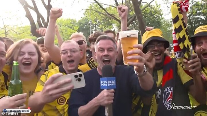 Jamie Carragher's 'drunk' interview with Jadon Sancho after he downed eight pints on Borussia Dortmund's famous 'Yellow Wall' left the CBS studio in hysterics.