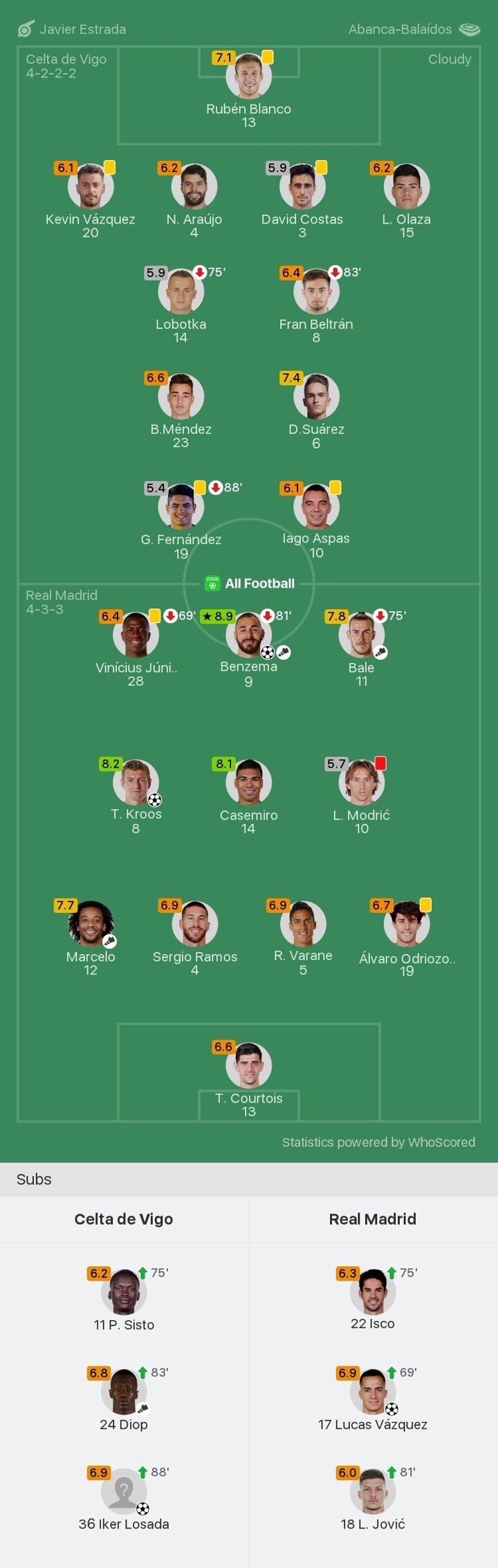 Sisto is extremely sloppy in possession ahead of his own penalty area as he intercepts a pass and then gives it away almost immediately, with Casemiro nipping in. They immediately press into the penalty area where Benzema’s beautiful turn opens up a lane for Lucas Vazquez to receive the ball and slot it past Blanco!