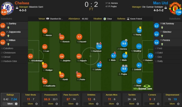 Although Chelsea initially looked the brighter of the two sides, United gradually improved and were good value for the lead when Ander Herrera nodded in from close range in the 31st minute, and Paul Pogba – provider for the opener – made it 2-0 on the stroke of half-time.