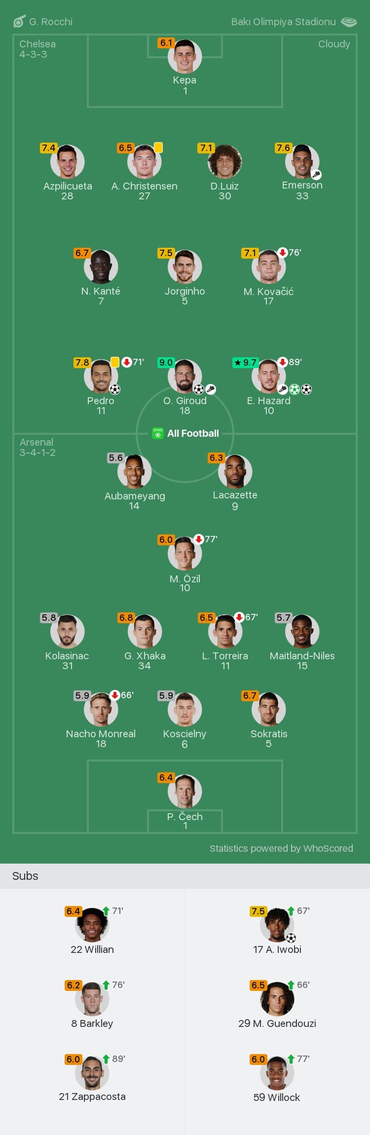 We bring you the player ratings for Chelsea vs Arsenal as E. Hazard becomes Man of the Match with a rating of 9.7.