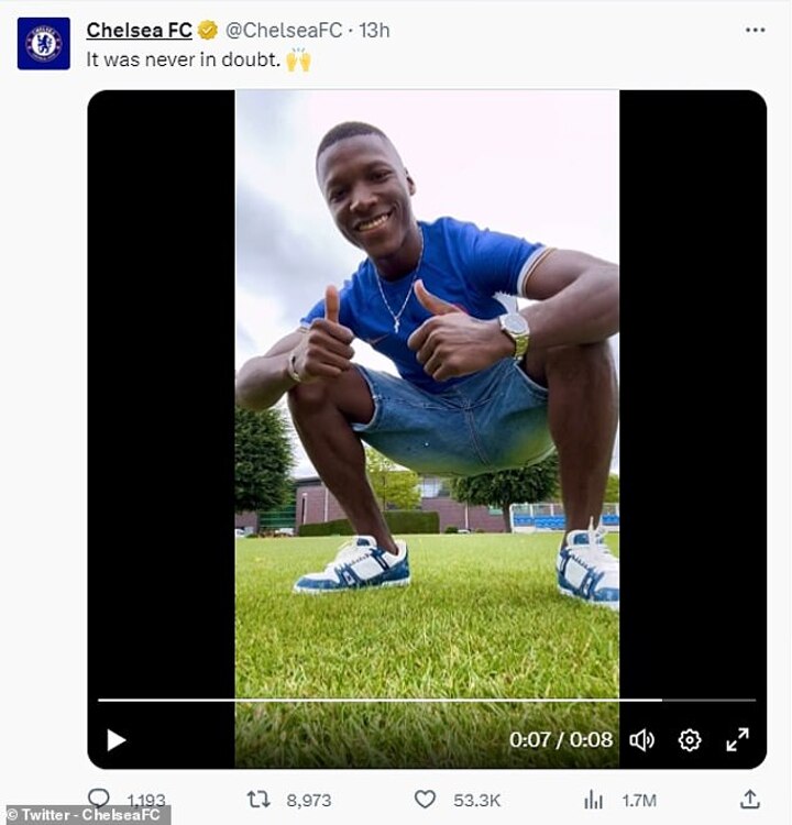 In another video tweet, Caicedo crouches down and says 'I was always a Blue' before putting his thumbs up. The caption for that tweet is: 'It was never in doubt.'