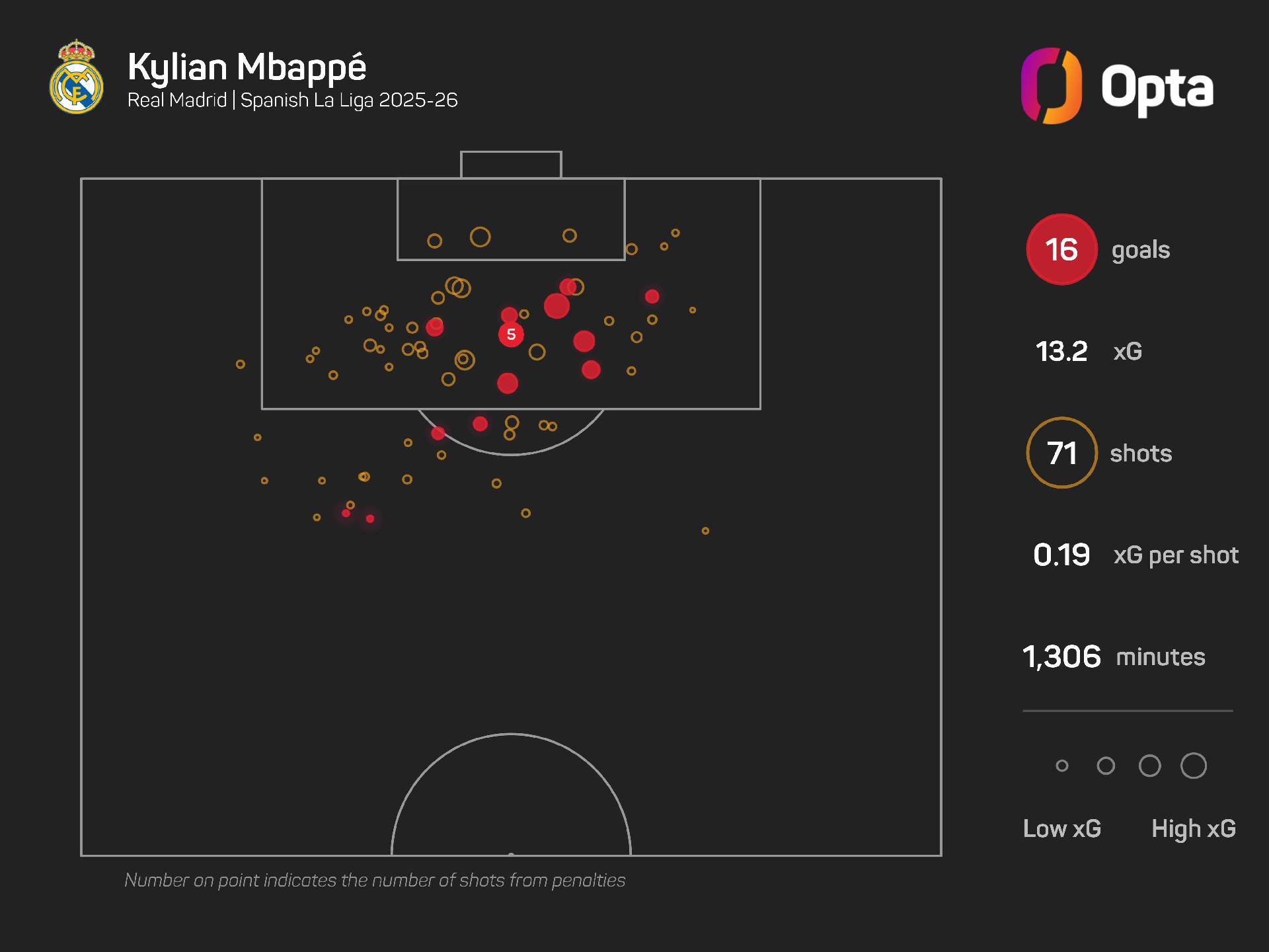 Mbappe has netted 16 times in 15 games in LaLiga this season, with those goals coming from an expected goals (xG) figure of 13.2.