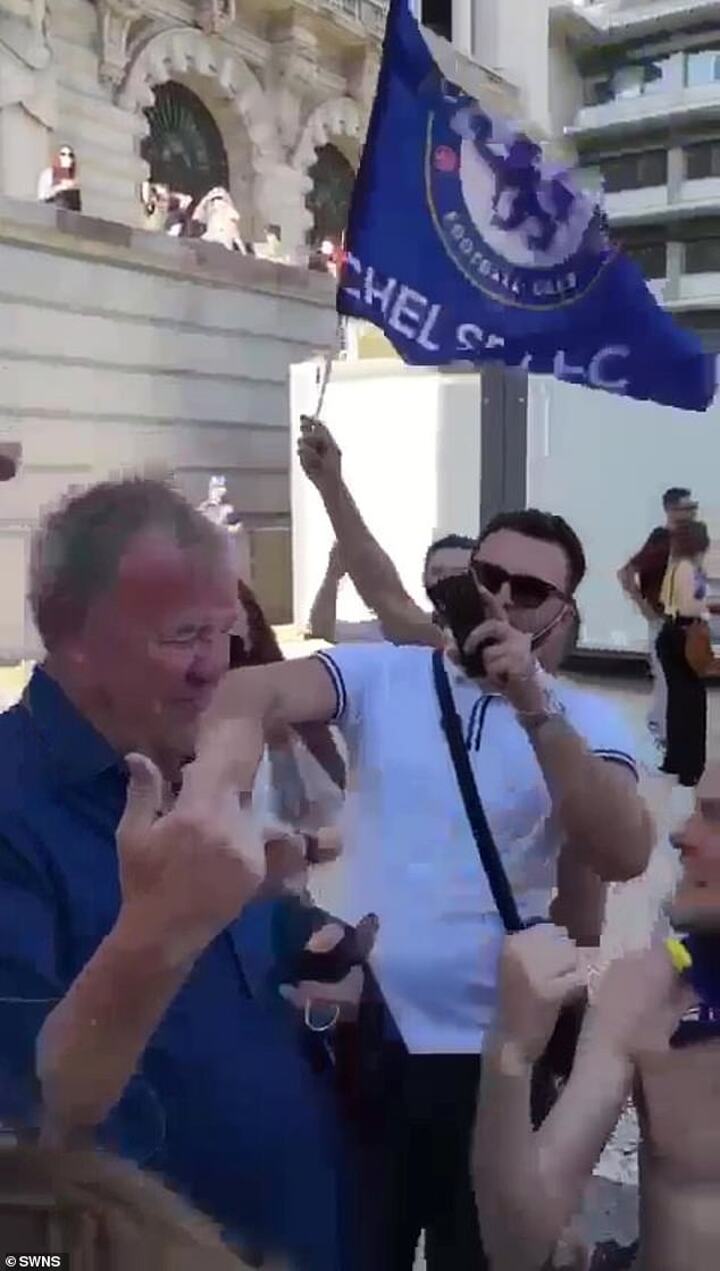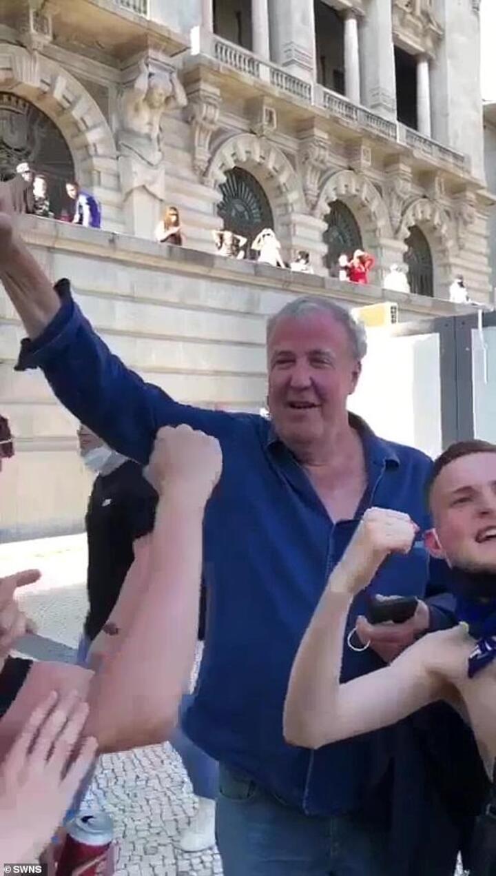 And, Jeremy Clarkson shouted obscenities, including: 'F**king Mancs!' as he celebrated in the Portuguese city with fellow Chelsea FC fans after their Champions League victory over Manchester City.